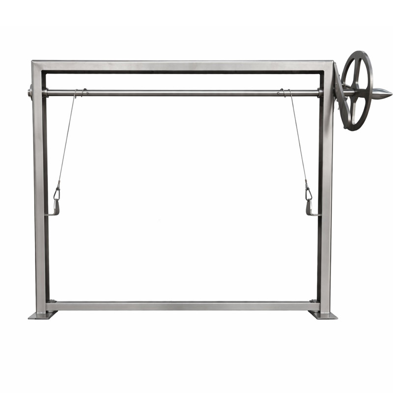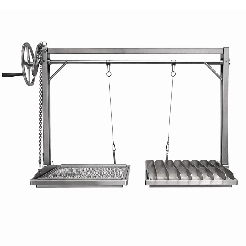 A fully adjustable stainless steel frame designed for precise asado style grilling over charcoal or wood embers.